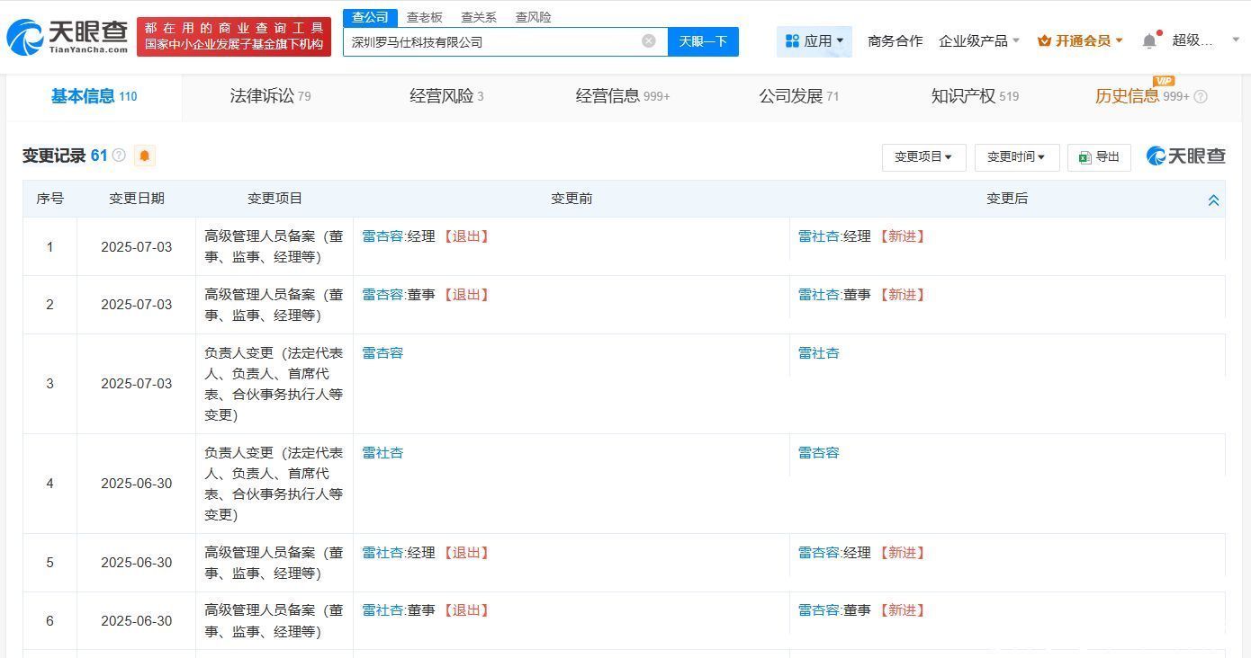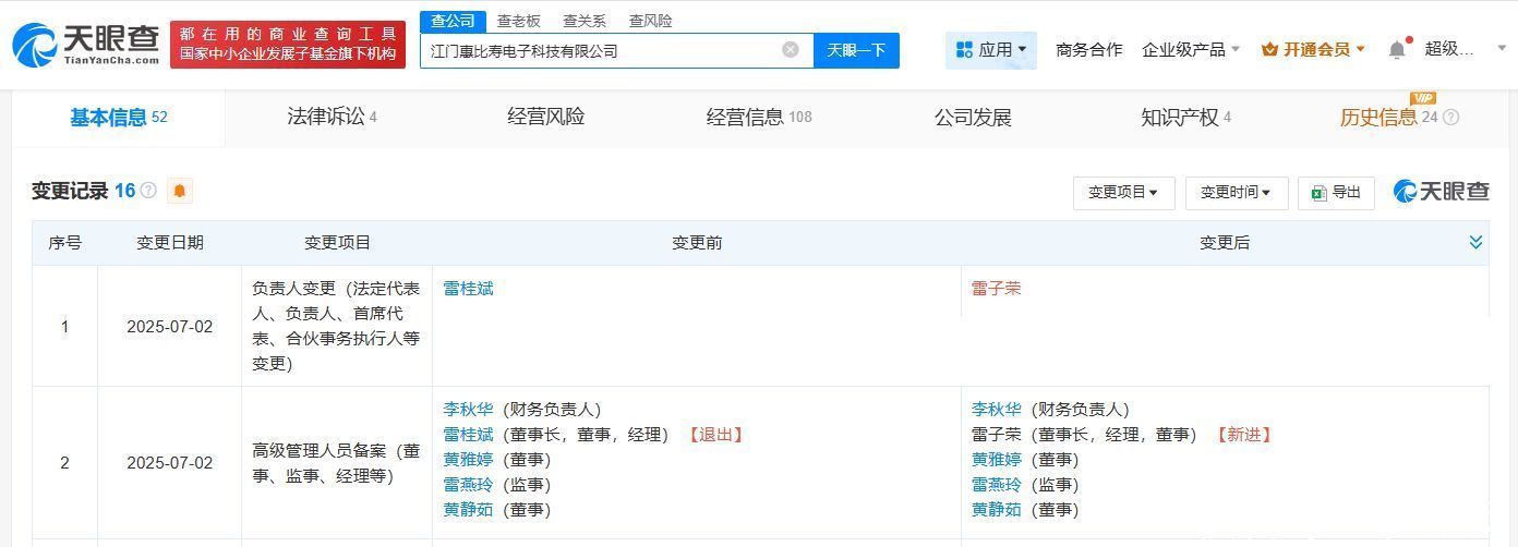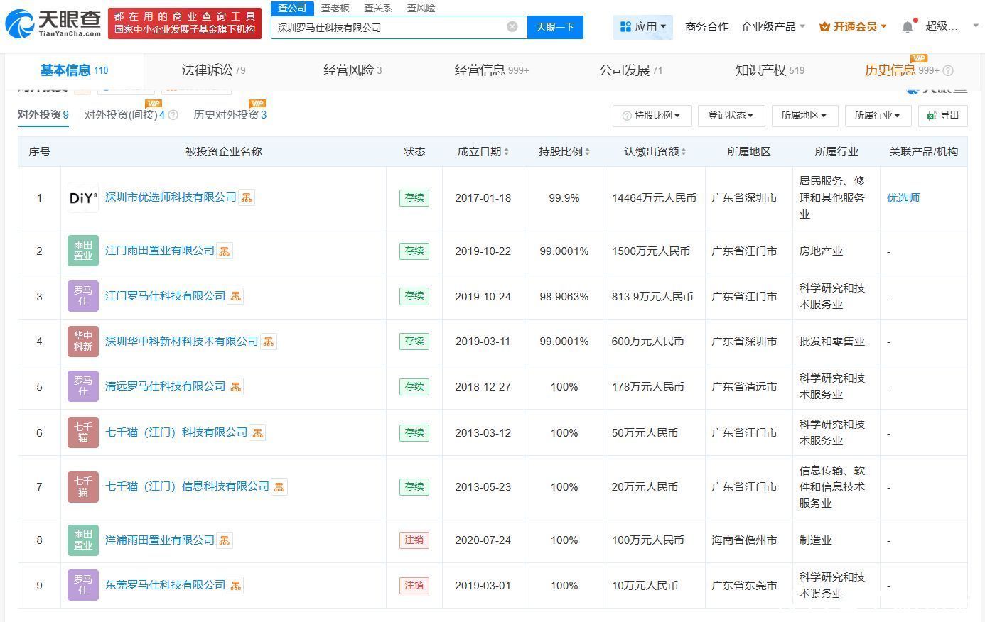 值得注意的是,近日,该公司法定代表人、董事、经理两次发生变更。此外,该公司旗下的清远罗马仕科技有限公司、深圳市优选师科技有限公司、深圳华中科新材料技术有限公司、江门雨田置业有限公司、江门惠比寿电子科技有限公司的法定代表人及高管均于近期发生变更。